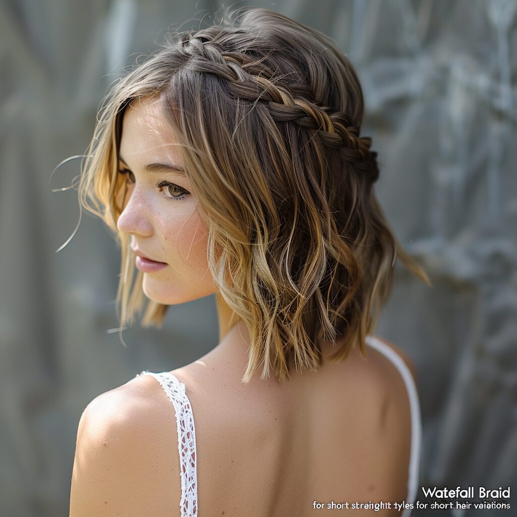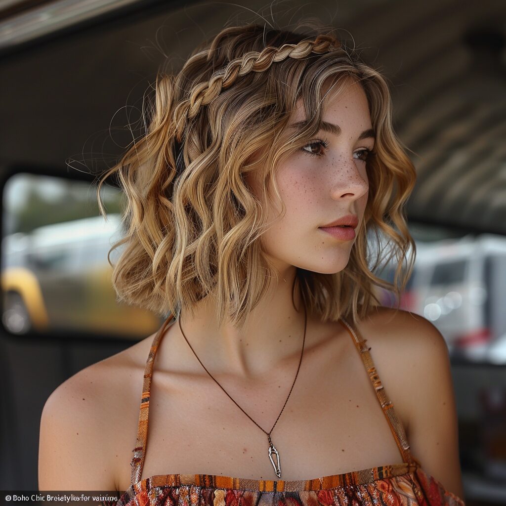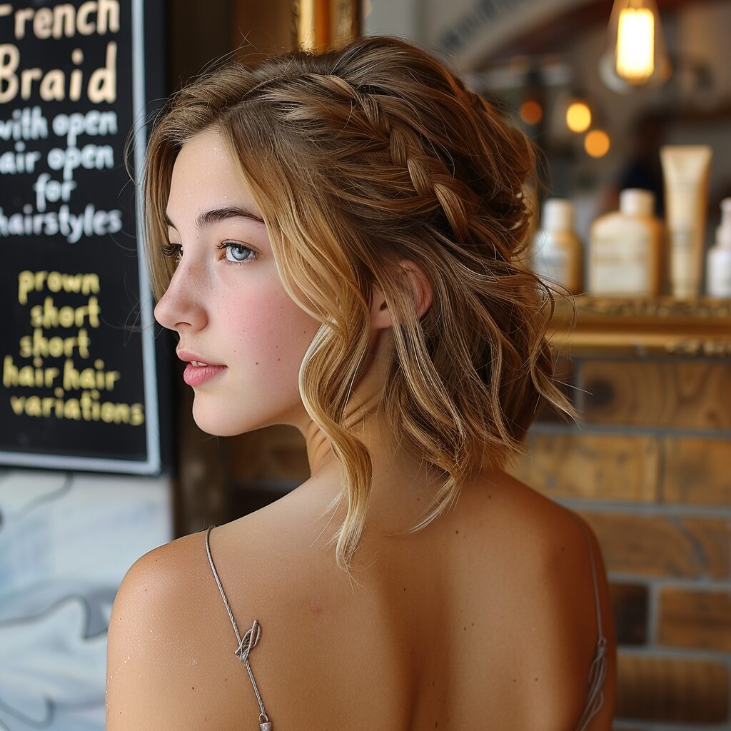 Elevate your waves with a charming French braid crown that exudes regal elegance. This intricate yet effortless hairstyle adds a touch of romance to your short hair, framing your face with delicate braids while showcasing your natural waves.