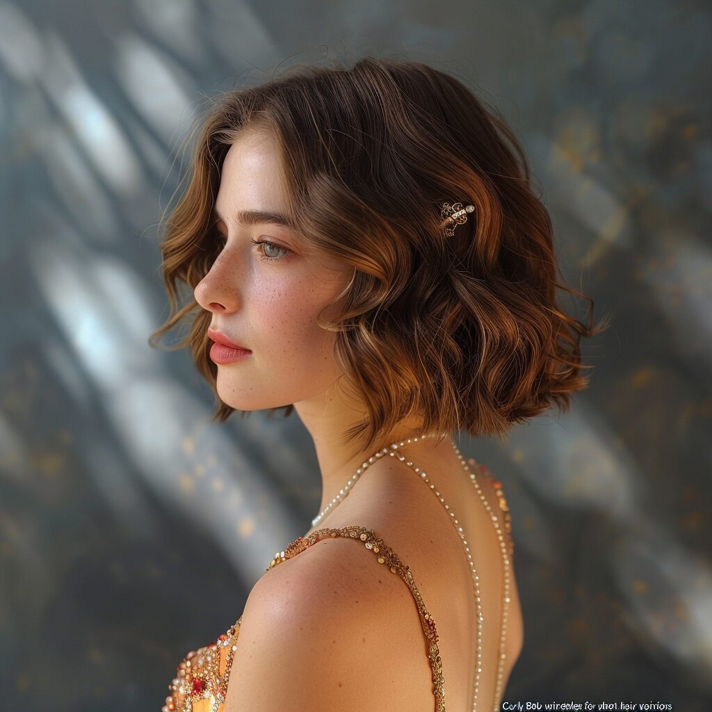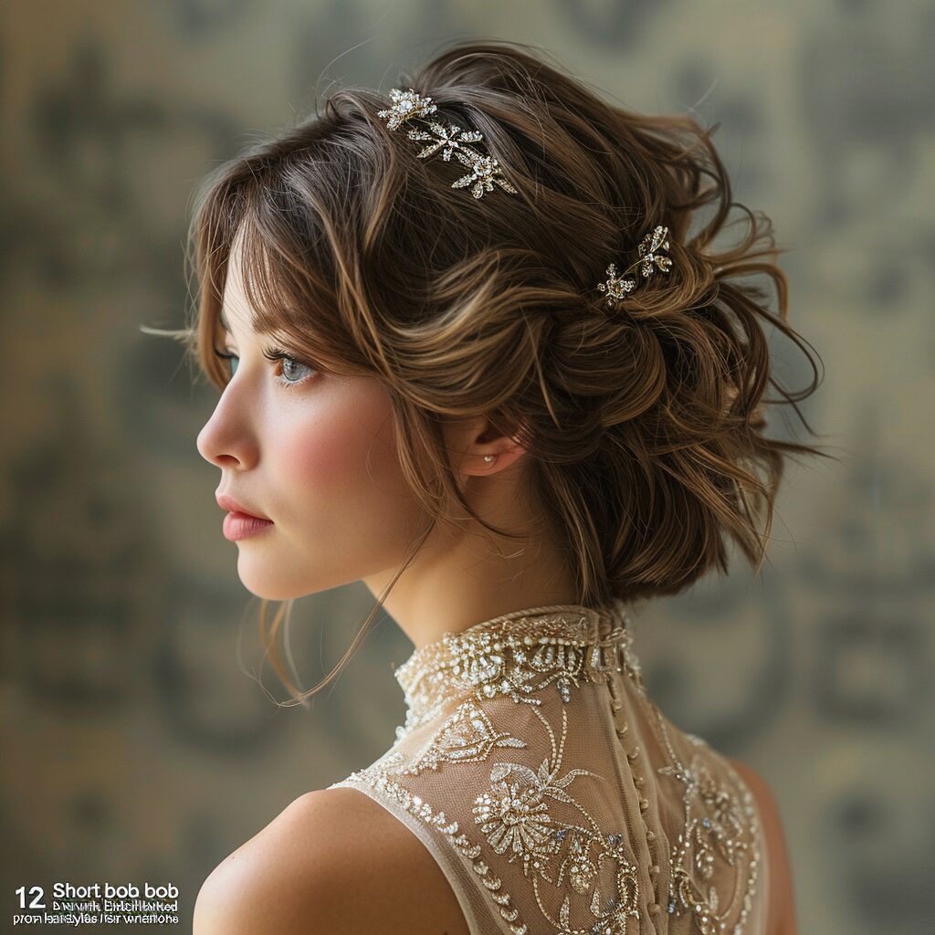 Enhance your wavy bob with a touch of elegance by adorning it with embellished pins. This playful yet sophisticated style adds a touch of glamour to your short hair, making it perfect for prom night or any special occasion.