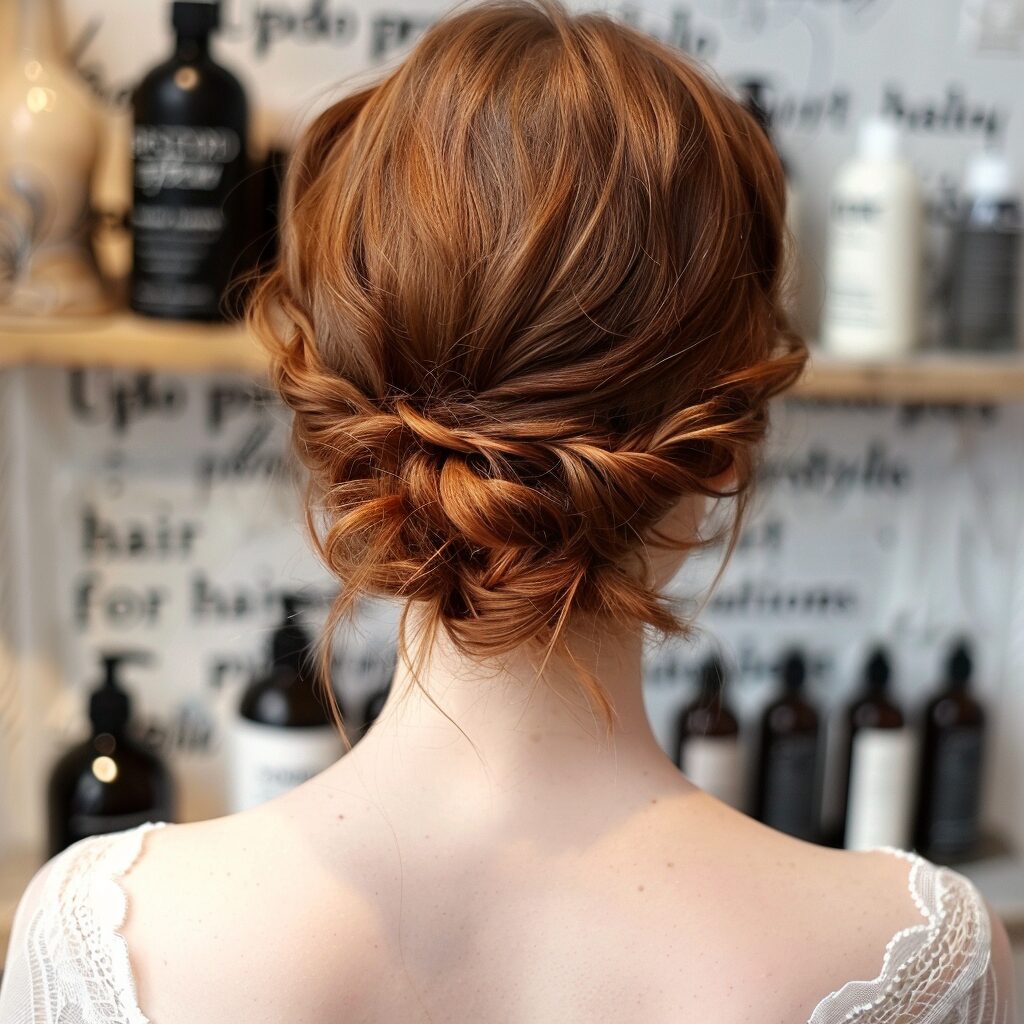 Create a dreamy and romantic look with a twisted messy halo updo. This effortlessly chic hairstyle offers a soft and ethereal vibe, framing your face beautifully while keeping your short hair in place throughout the night.