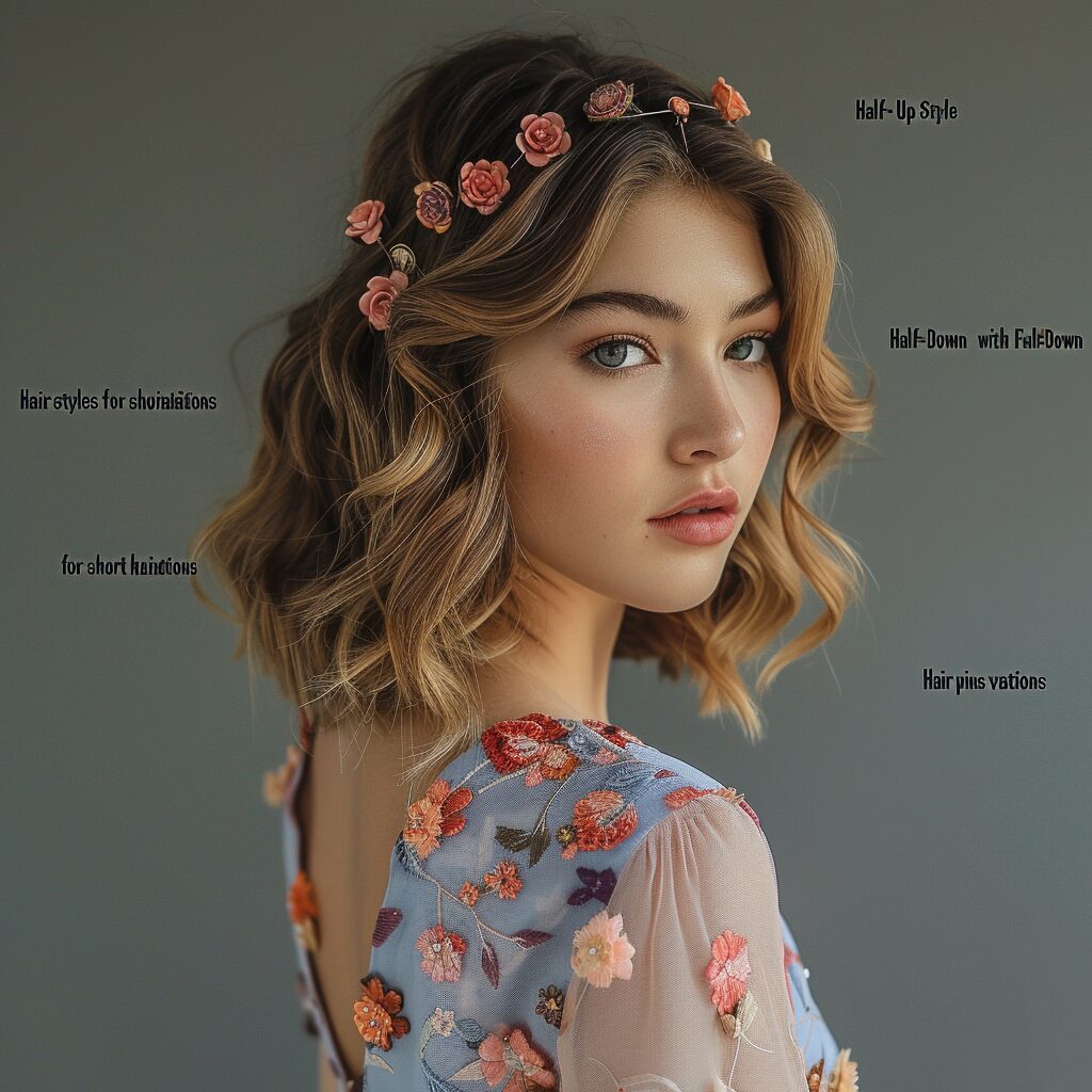 Infuse your short hair with a whimsical touch by accenting loose curls with floral hairpins. This enchanting hairstyle combines soft, romantic curls with delicate floral accents, creating a dreamy and ethereal look that’s perfect for a magical night like prom.
