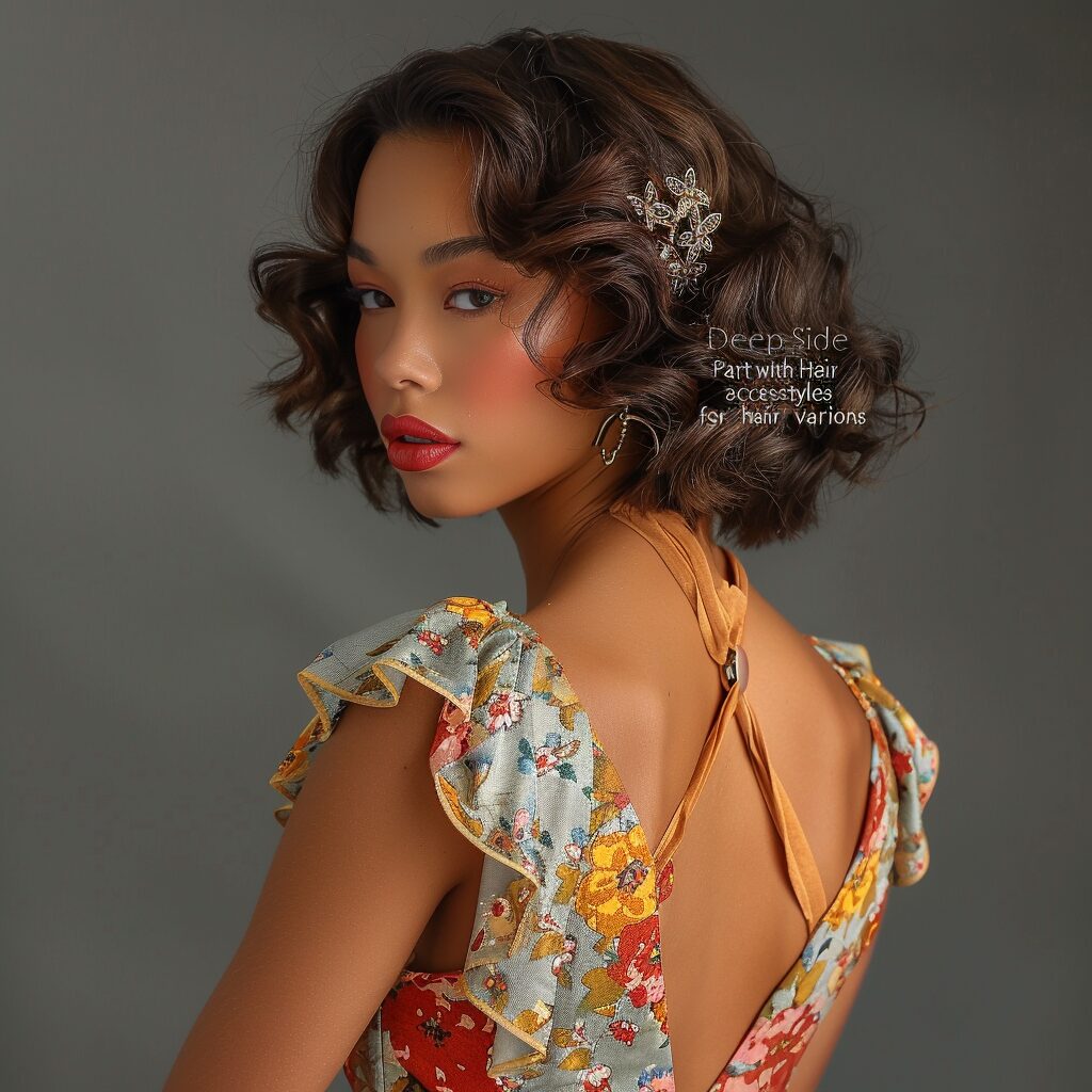 Make a statement with a deep side part adorned with a stylish hair accessory. This bold and sophisticated hairstyle adds drama and flair to your short hair, drawing attention to your features and enhancing your overall prom look with effortless glamour.