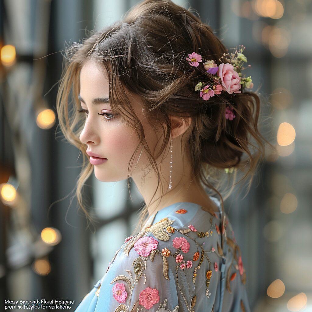 Effortlessly chic, a messy bun adorned with floral hairpins is perfect for a relaxed yet stylish prom vibe. It’s the ideal choice for those seeking a balance between casual and elegant.
