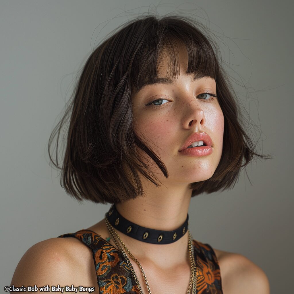 Channel timeless elegance with a classic French bob featuring baby bangs, a chic and sophisticated choice for round faces. The clean lines and minimalistic style of this haircut enhance your facial features, creating a refined and polished look.