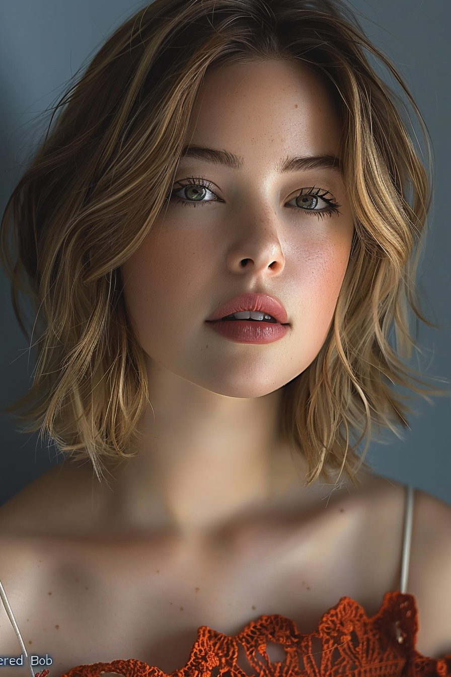 Enhance your natural beauty with a wavy bob featuring face-framing layers, a romantic and feminine hairstyle for round faces. The soft waves add texture and movement to your locks, while the face-framing layers highlight your features beautifully for a flattering and timeless look.
