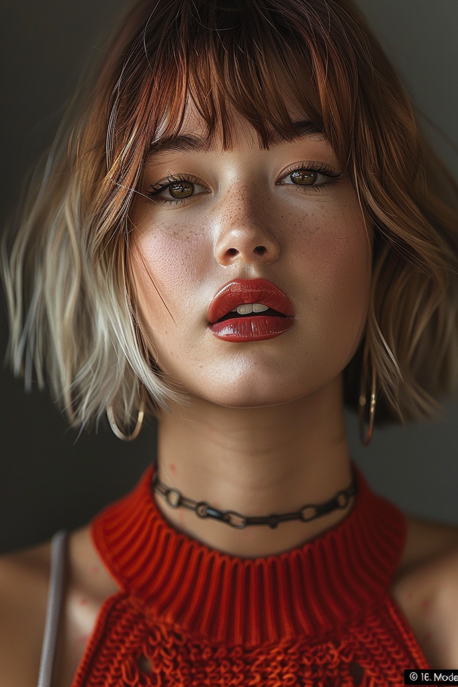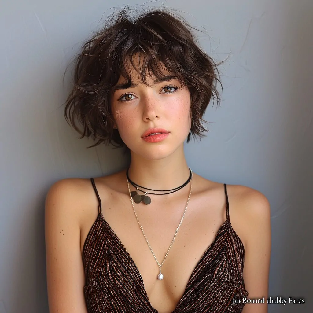 A short piece-y bob is a playful and trendy choice for round faces, featuring choppy layers that add texture and definition. This style offers a youthful vibe and can be easily styled with a bit of texturizing spray for a carefree finish.