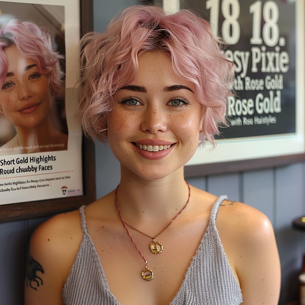 Infuse some color into your look with a rose gold messy pixie, a playful and feminine hairstyle for round faces. The rose gold hue adds warmth and vibrancy to your locks, while the messy styling adds texture and dimension for a modern and edgy vibe.