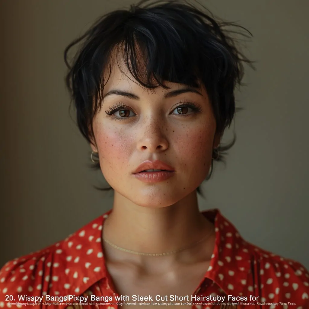 Frame your face with wispy bangs and a sleek pixie cut for a chic and sophisticated look. The wispy bangs soften the features of round faces, while the sleek styling adds a touch of elegance and refinement.