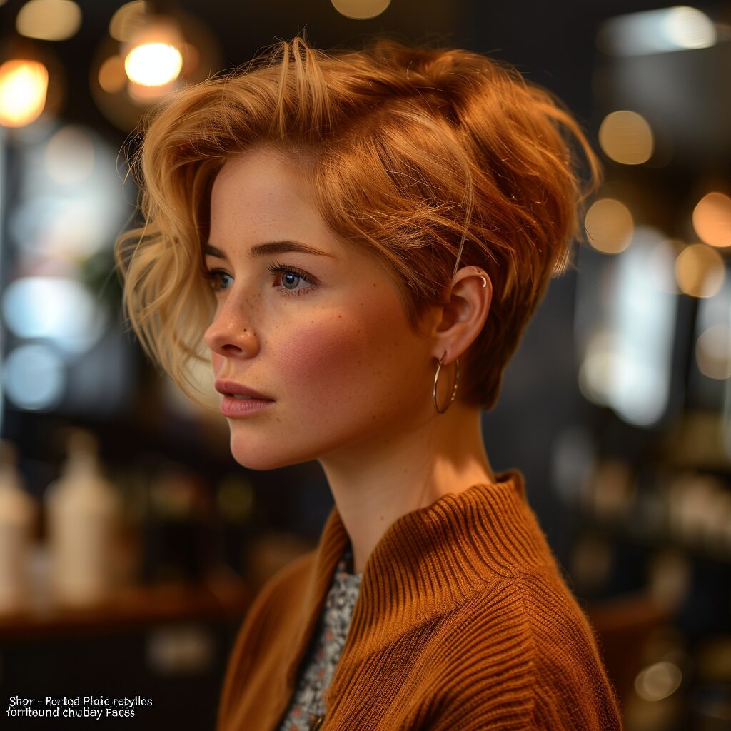 Make a statement with a side-parted pixie is a bold and daring choice for round faces. The side part adds asymmetry and visual interest, while the coppor color add depth and dimension to your locks for a vibrant and eye-catching look.