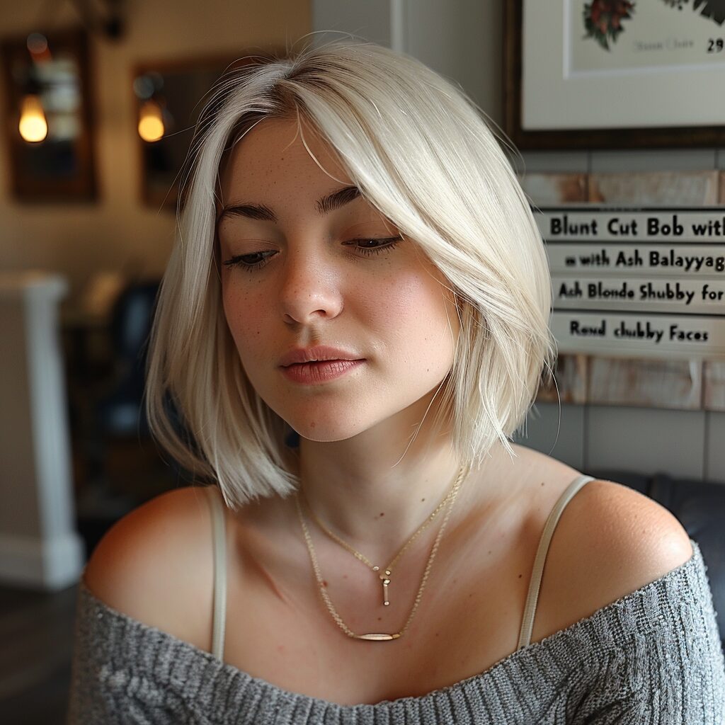 Achieve sleek sophistication with a blunt cut bob, a clean and minimalist hairstyle for round faces. The blunt cut adds structure and definition to your locks, while the bob length frames the face beautifully for a polished and refined finish.