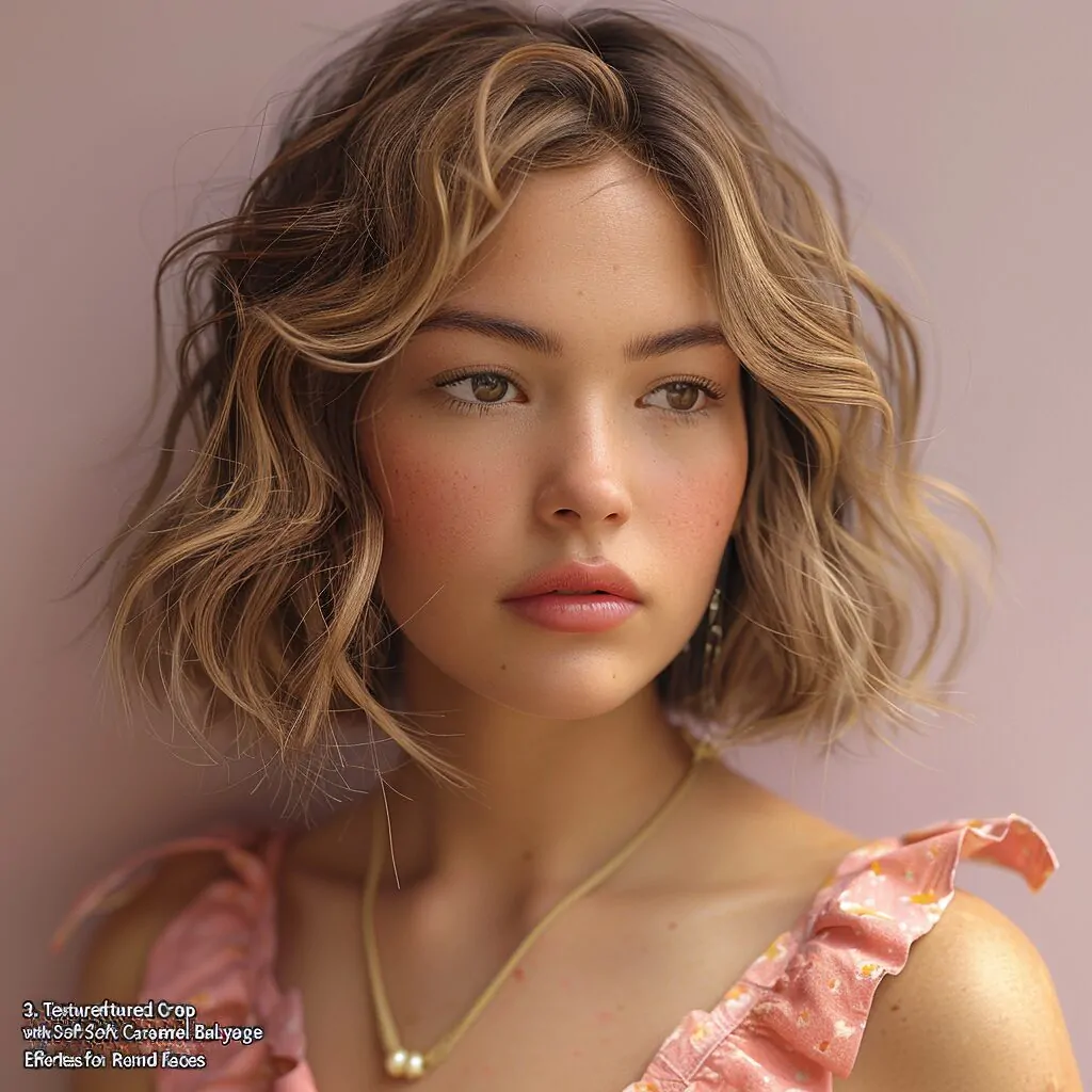 For a chic and modern look, opt for a textured crop with soft caramel balayage. This hairstyle adds depth and dimension to round faces while the caramel tones provide warmth and richness, enhancing your overall appearance effortlessly.