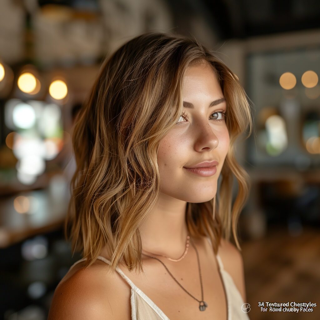 Achieve effortless beauty with a layered lob featuring beachy waves, a relaxed and casual hairstyle for round faces. The layers add movement and texture to your locks, while the beachy waves create a laid-back and carefree vibe perfect for any occasion.