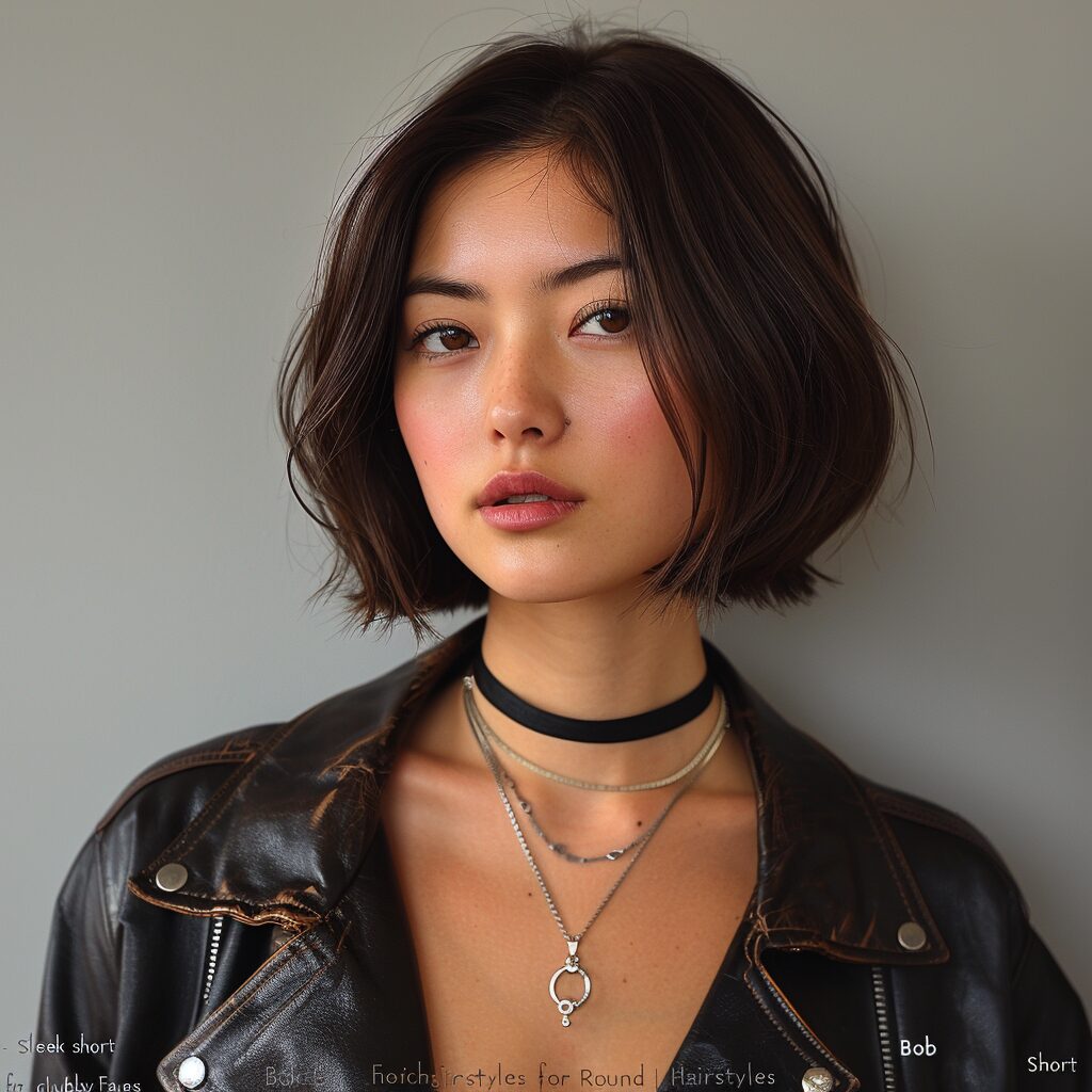 Achieve a sophisticated and polished look with a sleek short bob, perfect for round faces. This hairstyle exudes elegance and simplicity, making it an ideal choice for both formal and casual occasions.