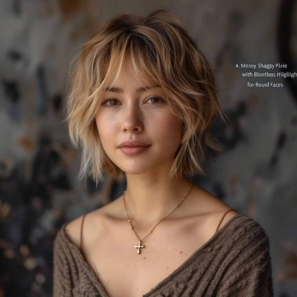 Add a touch of edginess to your look with a messy shaggy pixie featuring blonde highlights. This hairstyle adds depth and texture to round faces, while the blonde highlights brighten up your complexion for a youthful and radiant appearance.