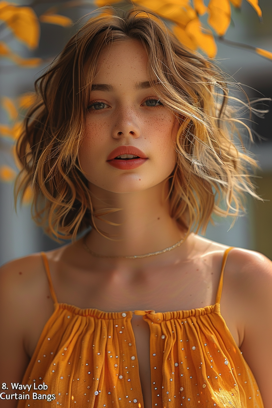 Elevate your look with a wavy lob featuring curtain bangs, a trendy and romantic hairstyle for round faces. The soft waves and curtain bangs frame the face beautifully, adding a touch of glamour and sophistication to your overall appearance.