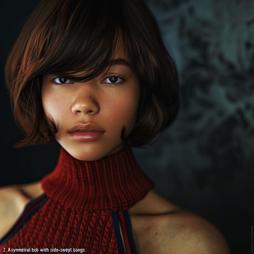 This edgy asymmetrical bob with side-swept bangs adds instant drama and flair to round faces. The asymmetry creates angles that beautifully complement the curves of a round face, while the side-swept bangs add softness and frame the face elegantly.
