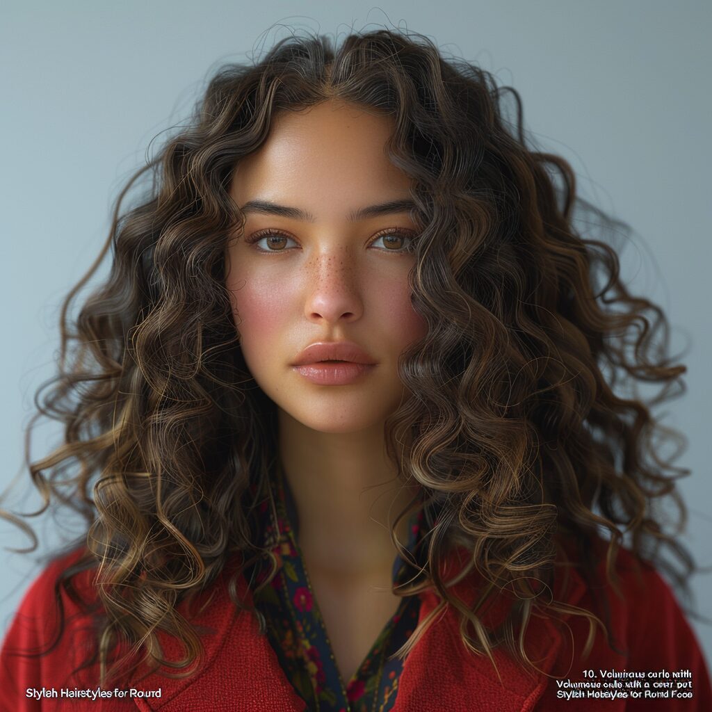 Opting for voluminous curls with a center part is a glamorous choice for round faces. The center part creates symmetry, while the voluminous curls add height and elongate the face, making it appear more oval-shaped for a stunning effect.