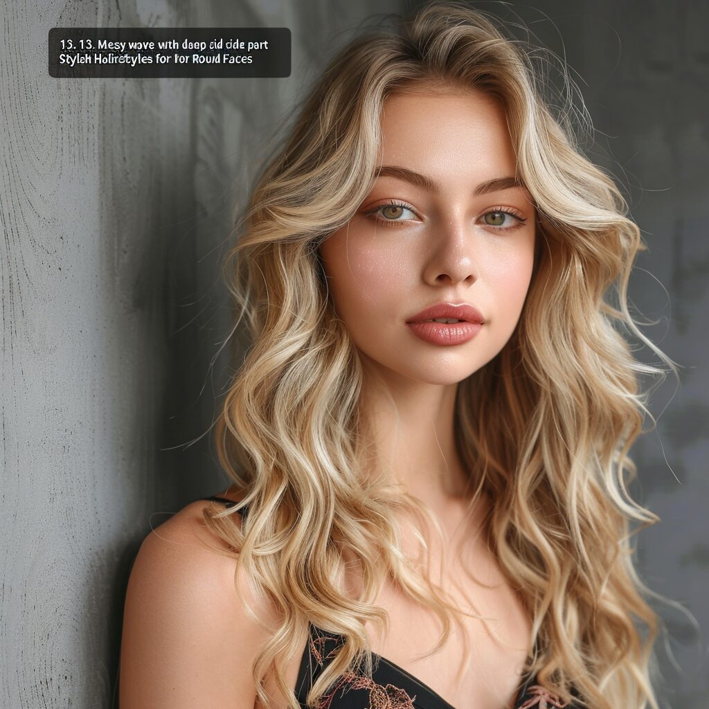 Messy waves with a deep side part offer a laid-back yet stylish option for round faces. The deep side part creates asymmetry, which can help to elongate the face, while the messy waves add volume and texture for a effortlessly chic appearance.