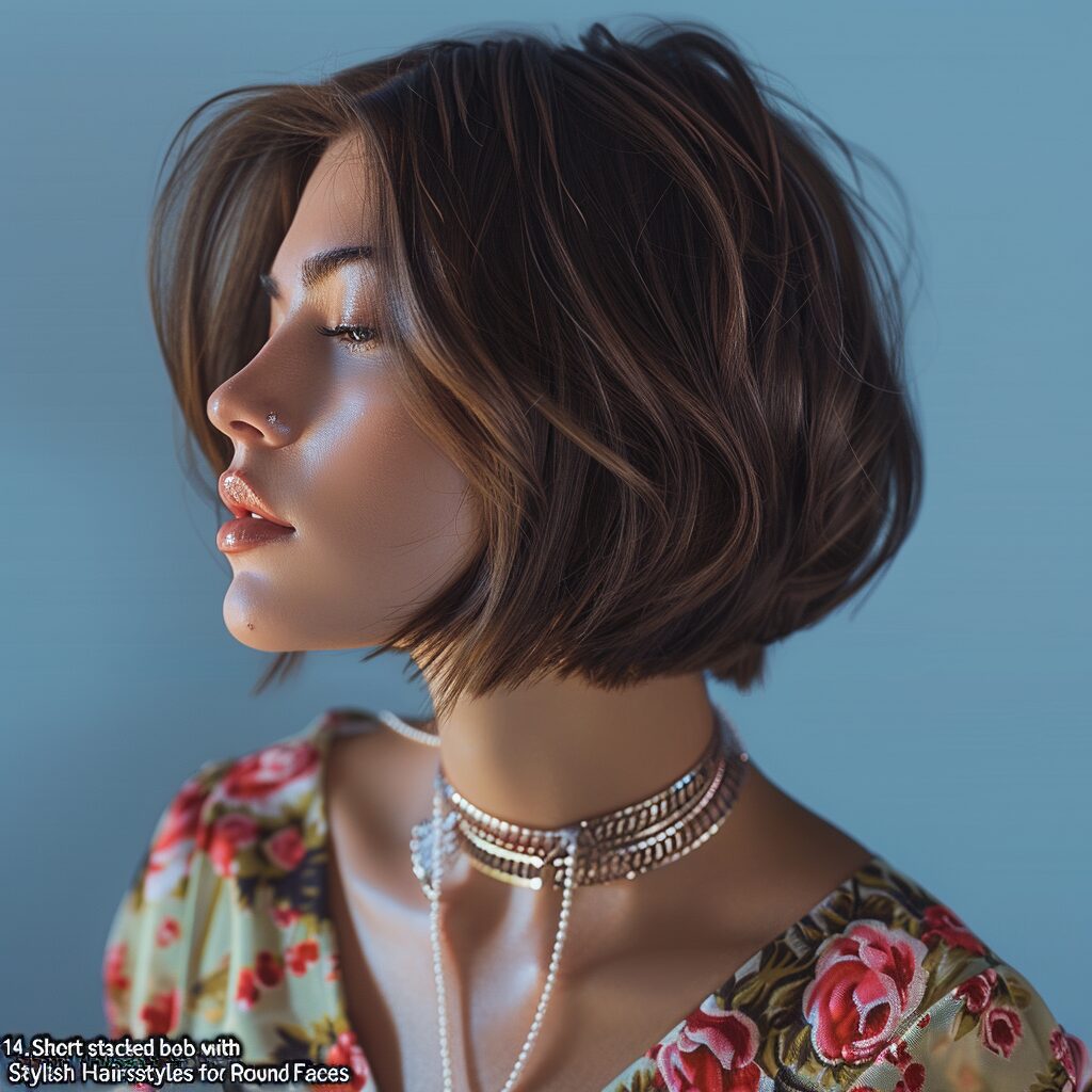 A short stacked bob with layers is a bold and modern choice for round faces. The stacked back adds height and volume, creating the illusion of a longer neck, while the layers around the face add texture and movement for a flattering finish.