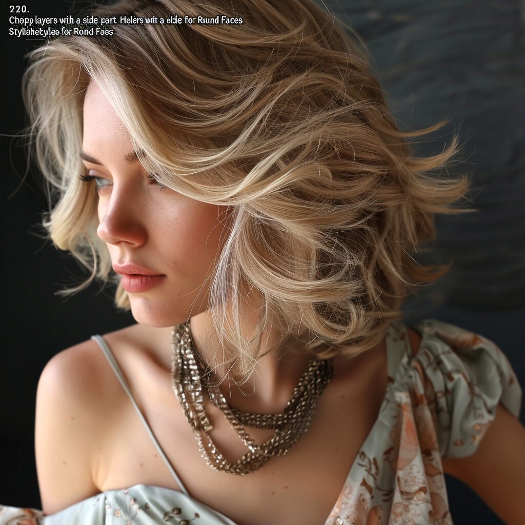 Choppy layers with a side part are perfect for adding texture and volume to round faces. The choppy layers create a tousled and effortless look, while the side part adds asymmetry, helping to balance the width of the face for a more flattering appearance.