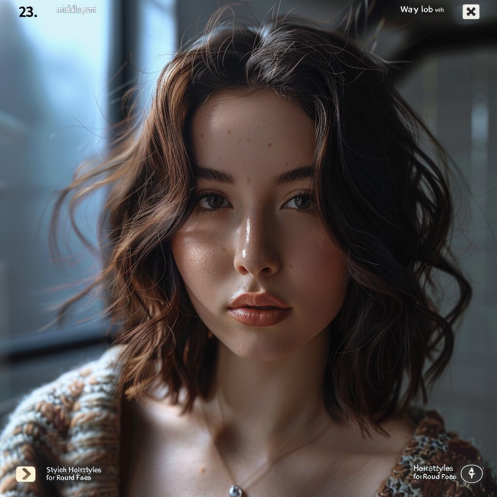 Choosing a wavy lob with a middle part is a chic and flattering option for round faces. The middle part creates symmetry, while the waves add volume and movement, creating a soft and romantic look that beautifully frames the face.