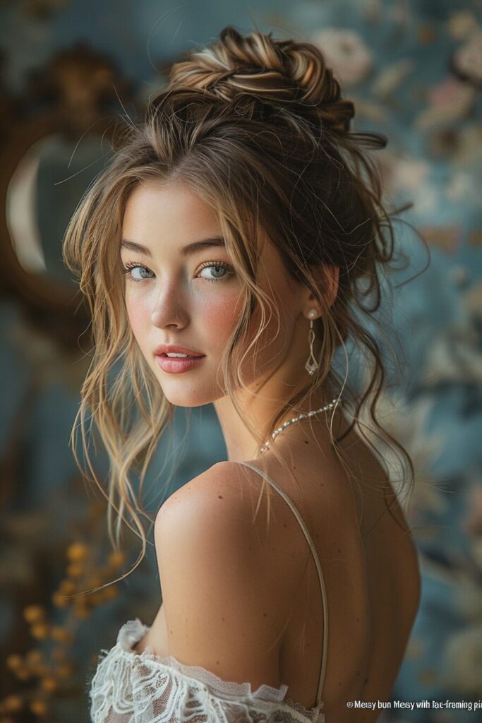 A messy bun with face-framing pieces is a stylish and effortless option for round faces. The messy bun adds volume and texture, while the face-framing pieces soften the look and draw attention to the features, creating a flattering frame for the face.