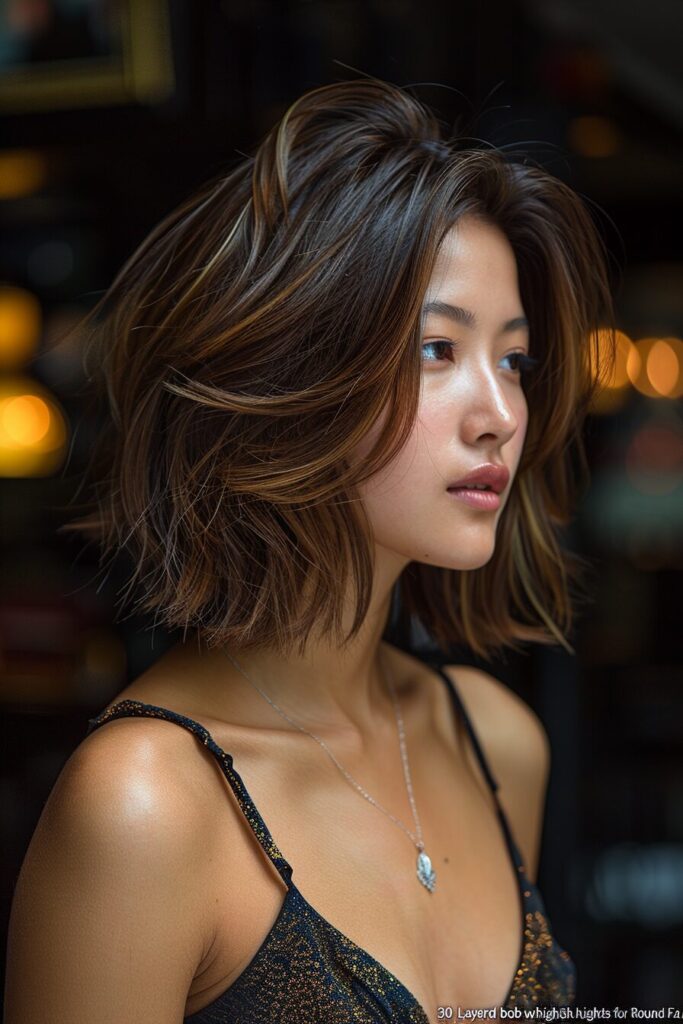 A layered bob with a side part and highlights is a versatile and stylish option for round faces. The layers add texture and movement, while the side part creates asymmetry, helping to balance the width of the face. Subtle highlights add dimension and depth, enhancing the overall look with a touch of brightness.