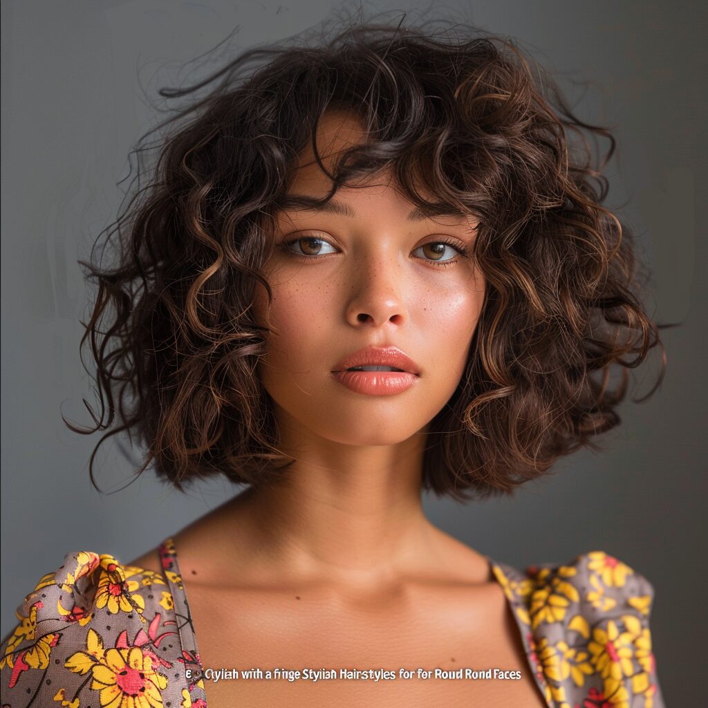 A curly bob with a fringe is a fun and flirty option for round faces. The curls add volume and bounce, creating the illusion of a slimmer face, while the fringe draws attention to the eyes and adds a youthful vibe to the overall look.