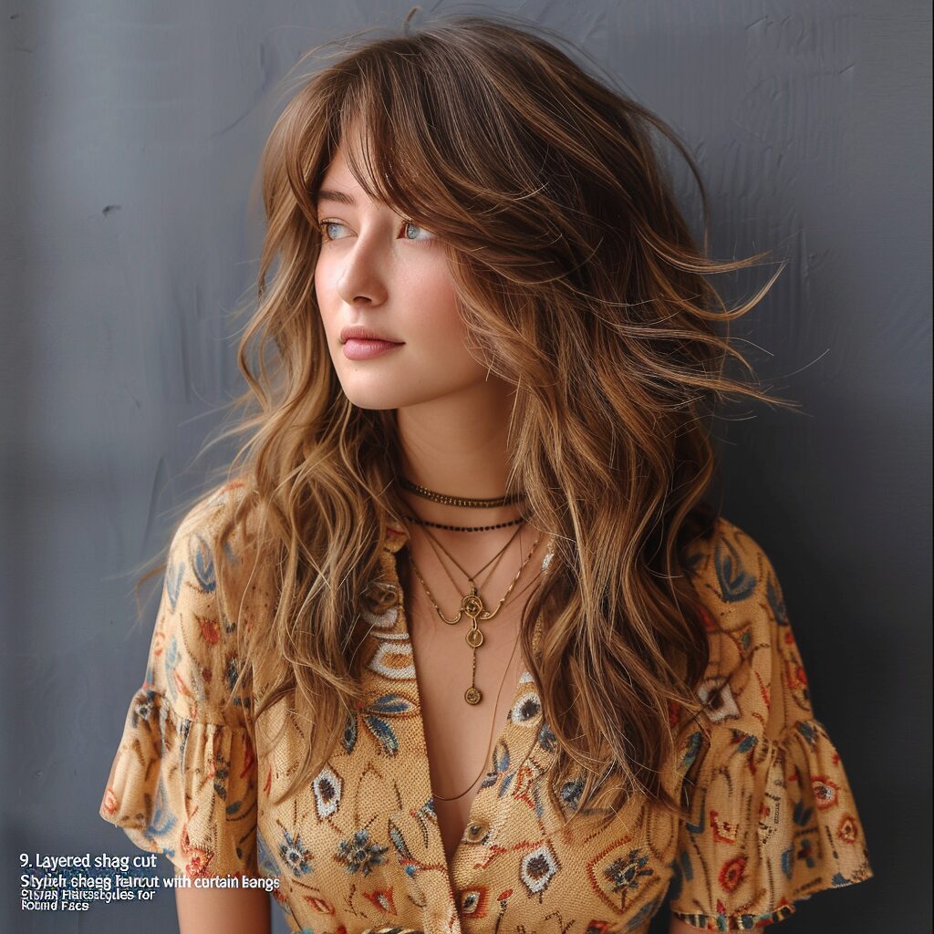 A layered shag haircut with curtain bangs is a trendy and flattering option for round faces. The layers add texture and movement, while the curtain bangs frame the face beautifully, drawing attention to the eyes and cheekbones for a stylish finish.