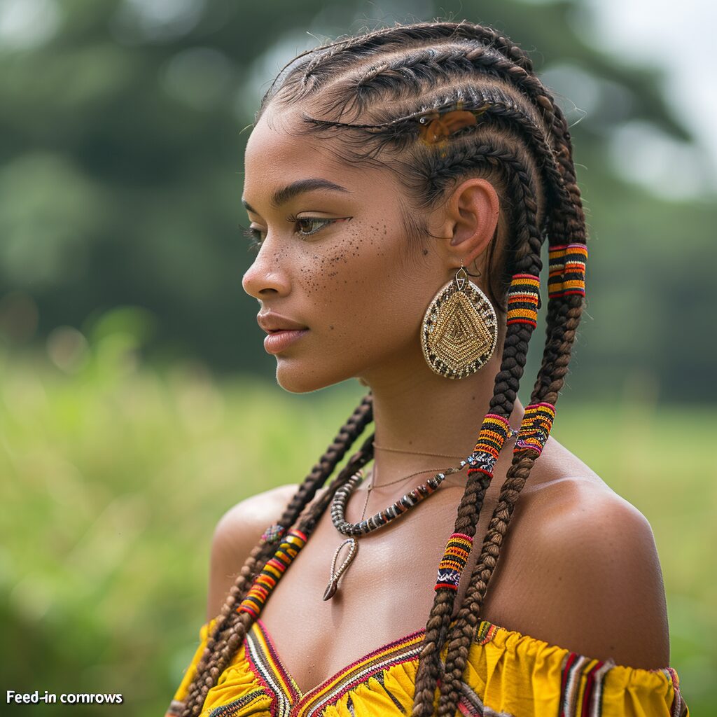Feed-in cornrows are a protective style that looks intricate and polished. They’re perfect for summer, keeping your hair neat and stylish for weeks.