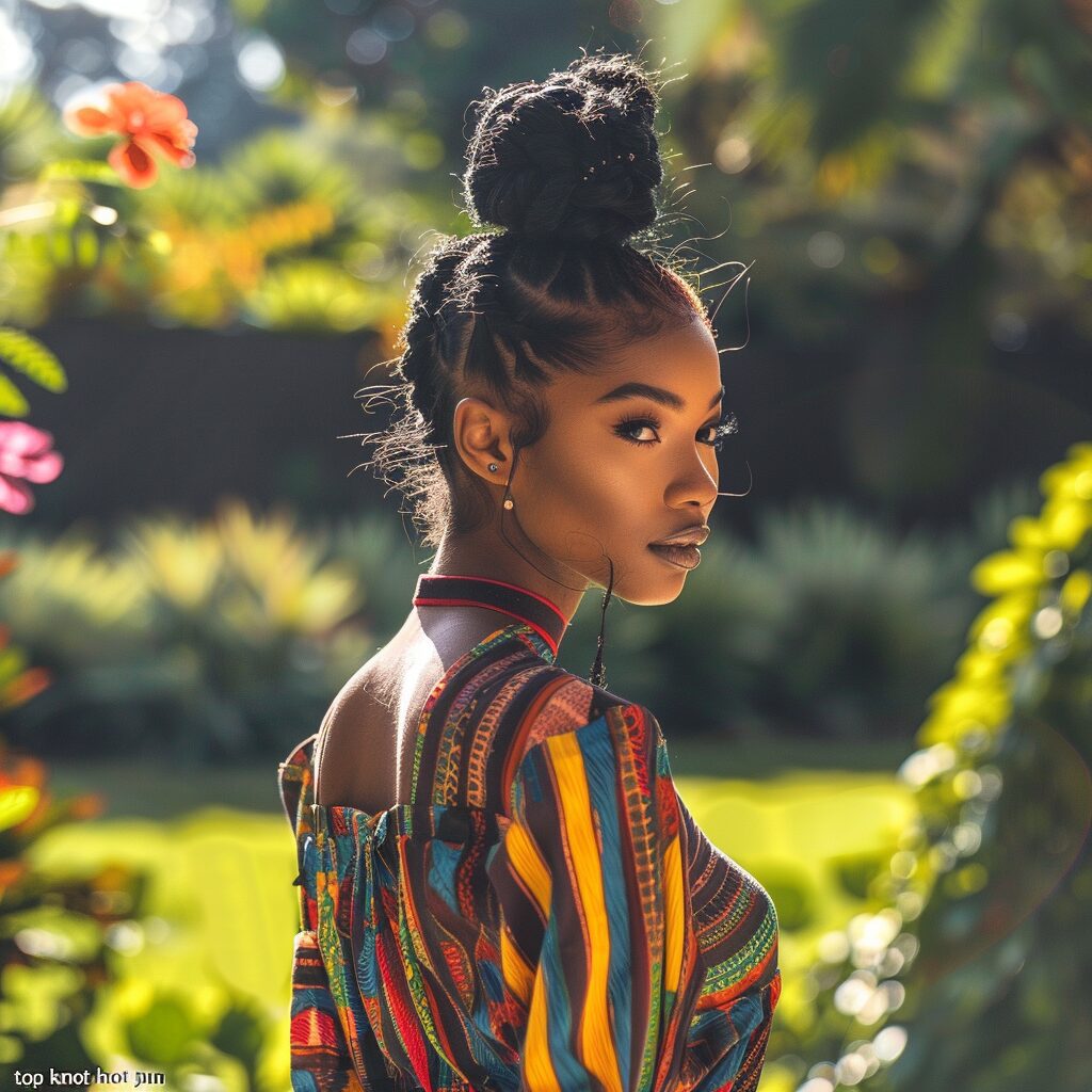 A top knot braided bun is sleek and elegant. This style is perfect for keeping your hair tidy and stylish during hot summer days.